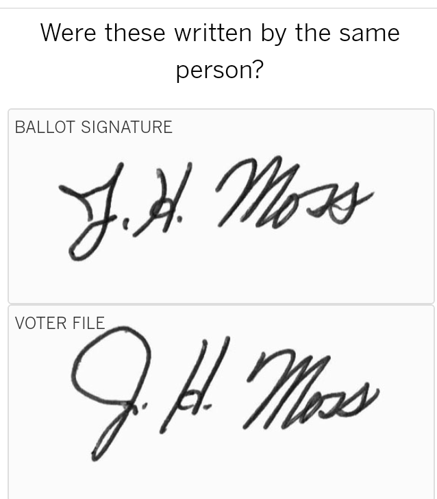 A: No. These signatures were written by two different people. In 30 states, voters are notified of a perceived mismatch and are given a chance to “cure” their ballot, in case officials made the wrong determination.