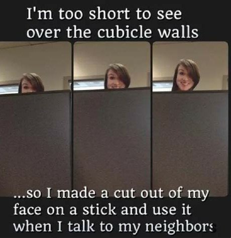 The cubicle image reminded me of my work in Electronics. I worked at a Manufacturer, they assembled and tested Electronic Switching Equipment, used by various firms, this was in the 1980s. The Modules were incorporated into Chassis, loaded with Software, and ran routines, while in an Environmentally Heated Walk-in Cooler (it was supposed to experience heat then cooling cycles, but they eventually used only heat). The area would see different levels of staffing, days off, overtime, etc. Bored, I stalked the guy from Afghanistan. He was a decent guy, came from money he said (in Afghanistan) and he was working in his cubicle. I positioned my head so that was all that could be seen. I stared and stared at him, he never noticed. I started to turn down his radio, but he would reach up and tweak the control without looking, not knowing anyone was there. I finally let out in a guffaw, laughing how ludicrous this was, and he then startled and fell off his seat.