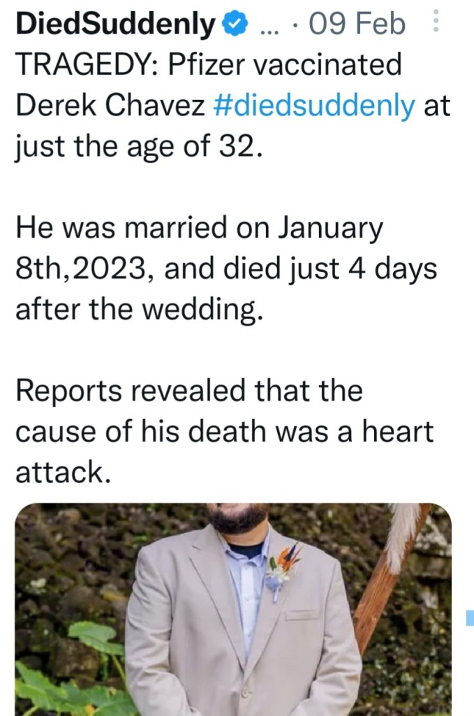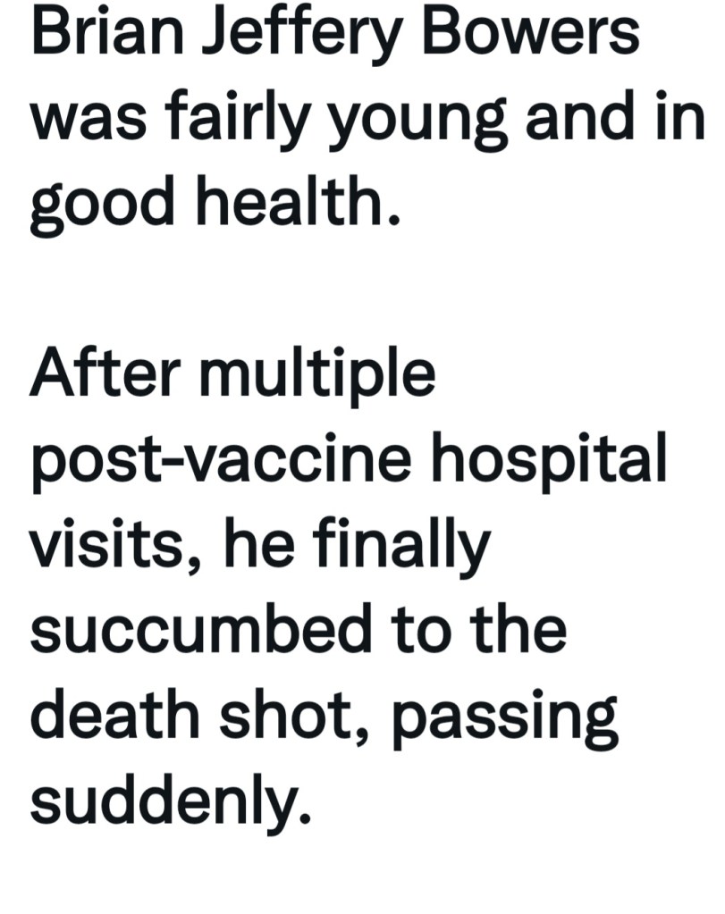 Sadly, no one can be poisoned by 200 times the normal dose of Covid ‘vaccine’ and not eventually succumb to the overwhelming effects. That’s why these jabs are called Bioweapons ~ because they kill people. Some immediately and some days, weeks, months or even years later. Every player involved in this mass genocide-for-profit needs to be brought to justice and made to pay for their crimes. Fauci, Bill Gates, Walensky – former CDC Director, big Pharma, mainstream Media for their part in suppressing the truth, slandering truth-tellers and promoting the lies; the FDA, CIA, the entire Obiden administration, George Soros and family, the Chinese and their Wuhan lab, and so many more.