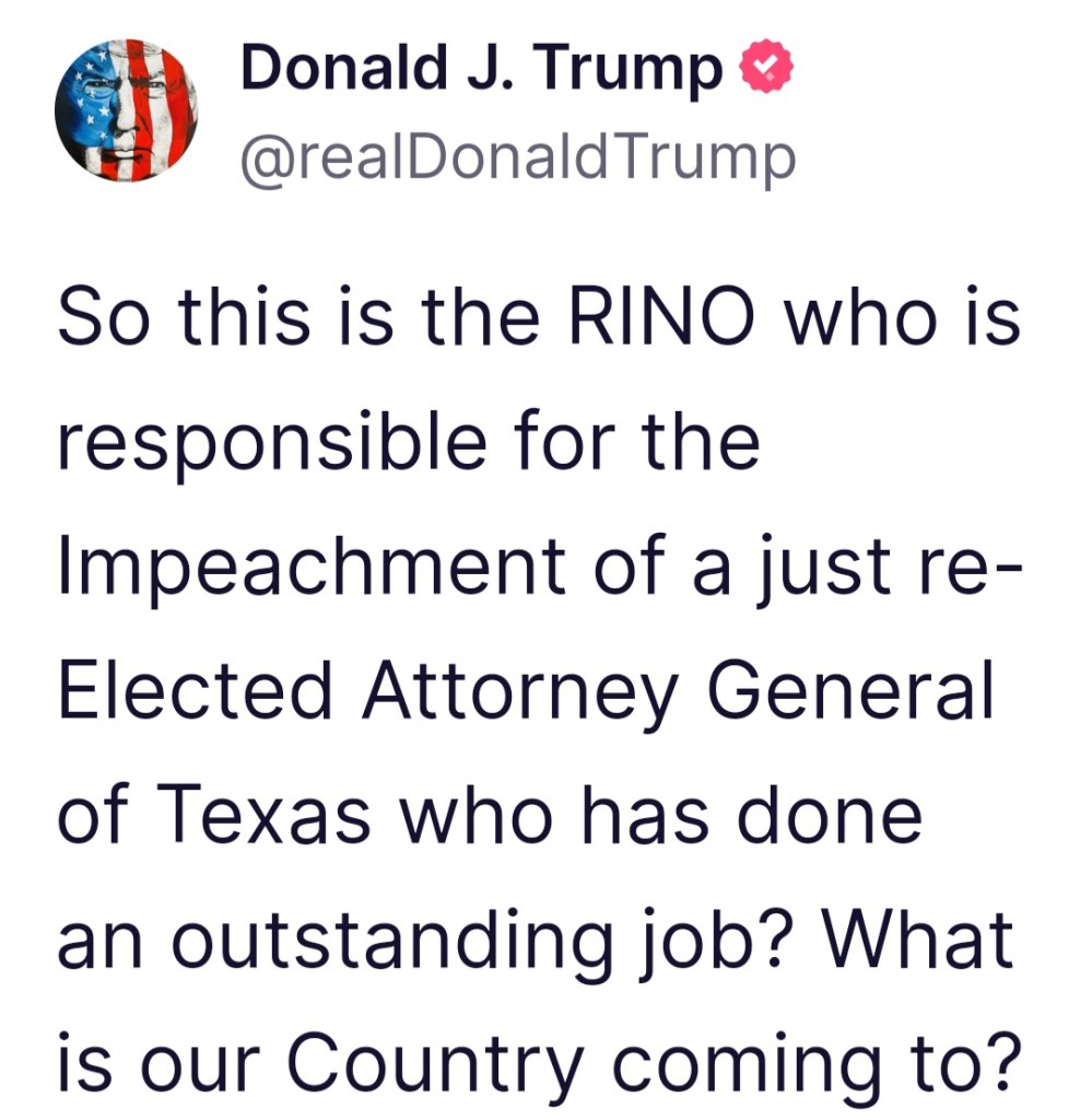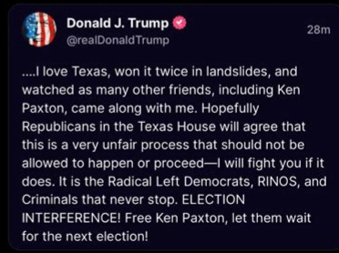 “The RINO Speaker of the House of Texas, Dade Phelan, who is barely a Republican at all and failed the test on voter integrity, wants to impeach one of most hard working and effective Attorney Generals in the United States.”
