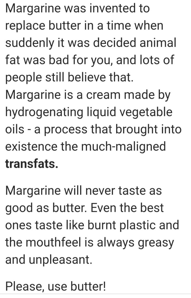 I agree. Butter is the real thing and tastes wonderful as one of my grandchildren says: ” I love butter”!