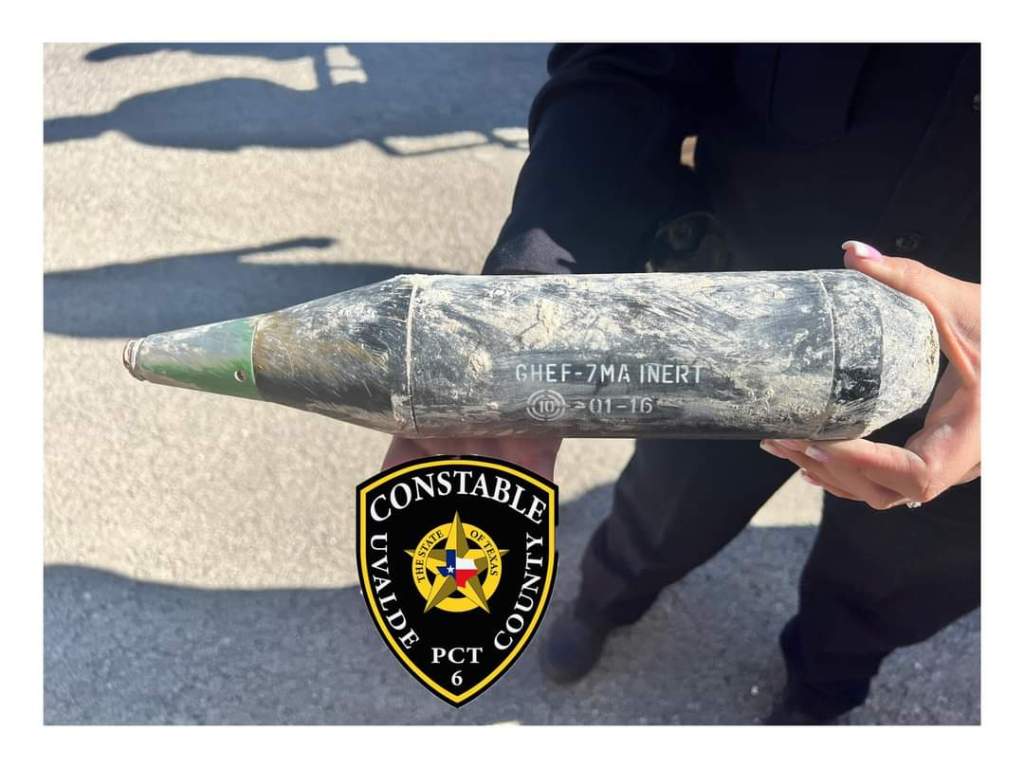 The picture below caused much concern in Del Rio at first, but it was identified as an inert warhead of a training round for the RPG-7 Anti-Tank Weapon. It appears to have been fired previously. It was recovered from a weapons range on a military post.