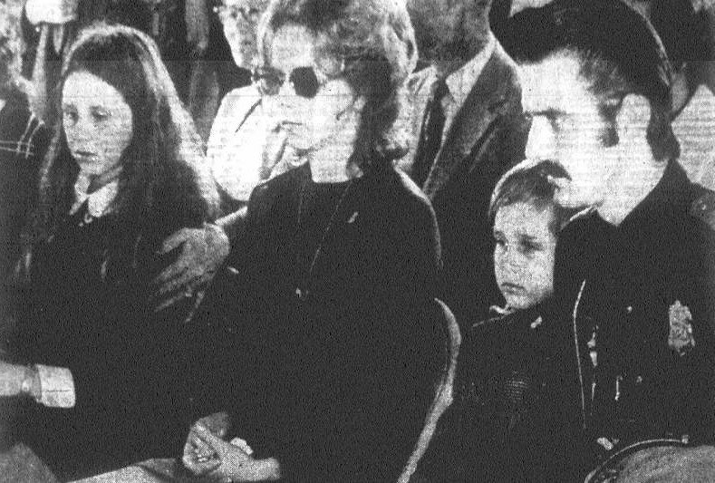 Mrs. Dorothea Jacobs, wife of slain San Antonio Patrolman George Jacobs, her two children, Michelle, 14, and Vincent, 9, and her brother, Patrolman Louis Ryan, sorrowfully sit at Mission Burial Park South, as last rites for the officer are performed. About 1,500 persons attended the funeral services for the four-year police veteran, who was found shot once in the head near a robbery scene at Rigsby and Clark avenues Sunday. Published in the San Antonio Express Jan. 18, 1973.