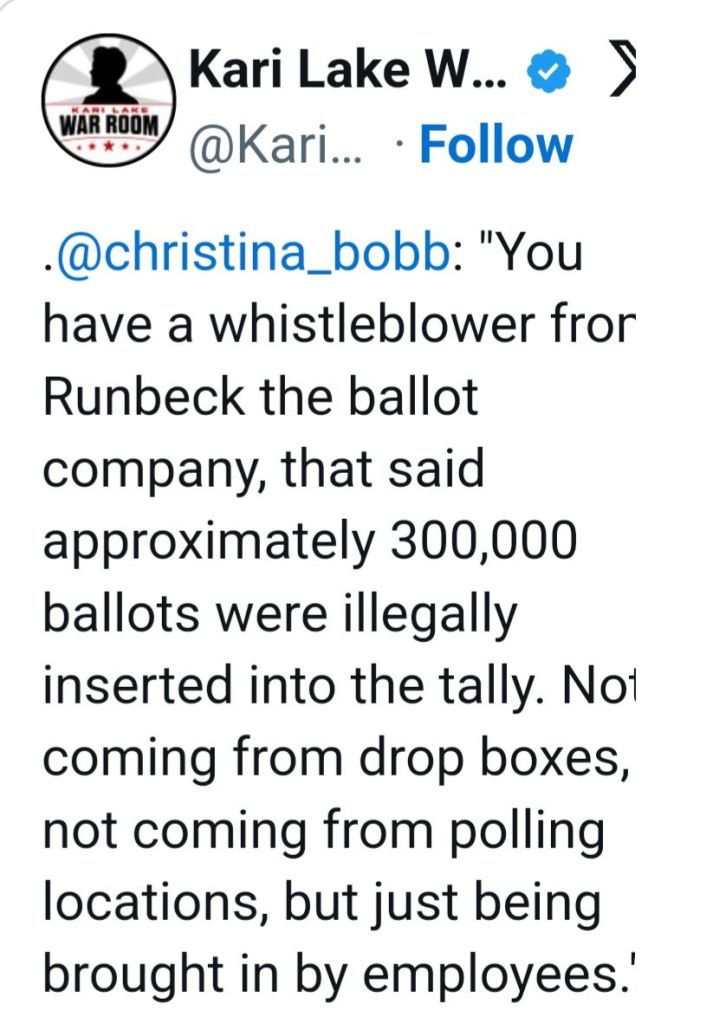 ● In October 2020, she said they discovered over 100,000 ballots and $13 million in two unmarked rental cars being unloaded at a home in Mesa and then driven to Runbeck Election Services.