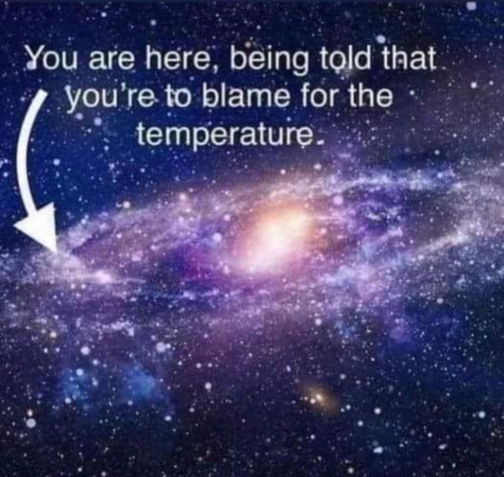 Runner up: “You are here (a tiny speck in the universe) being told you are to blame for the temperature.” 🙂