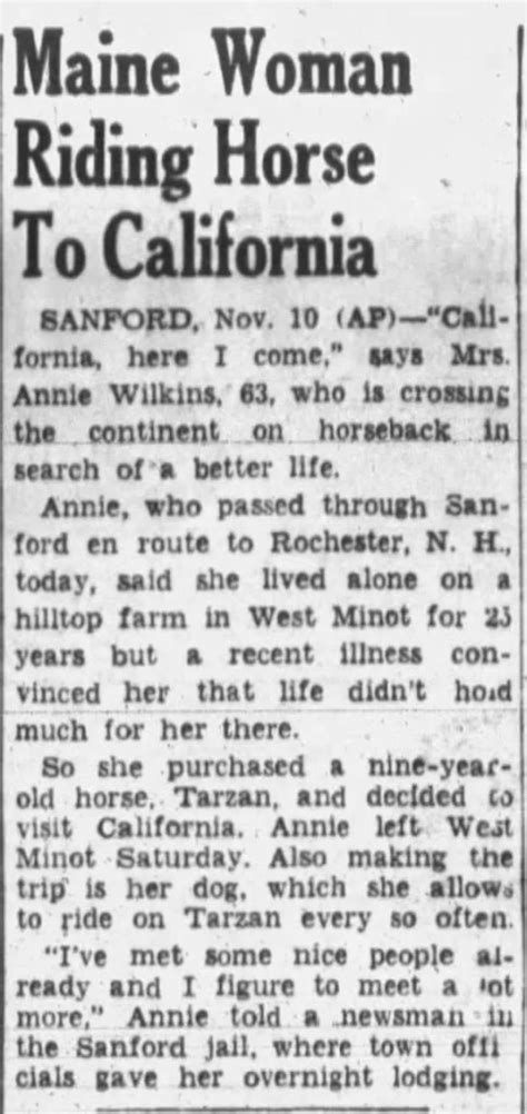 Shortly before her planned journey to Hollywood to make an appearance on “Art Linkletter Show,” tragedy struck Wilkins. Her packhorse, Rex, accidentally stepped on a rusty nail, resulting in a fatal case of tetanus, and sadly passed away on March 1, 1956. Despite this setback, Annie remained in California for at least another year before eventually returning to her hometown in Maine in 1957.