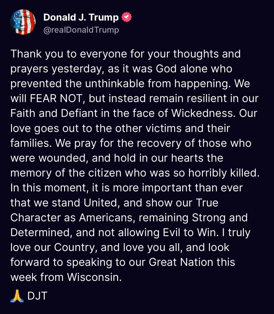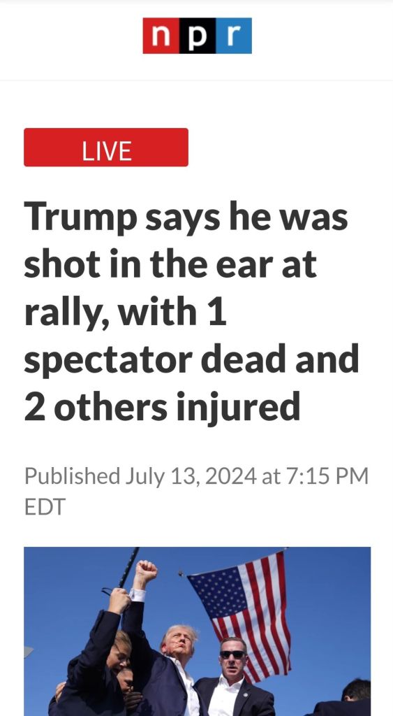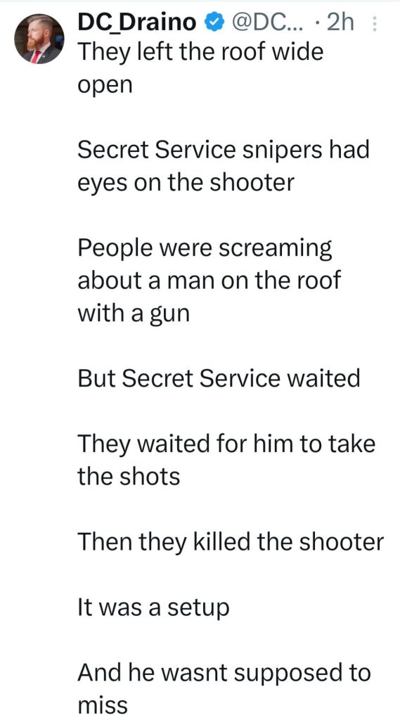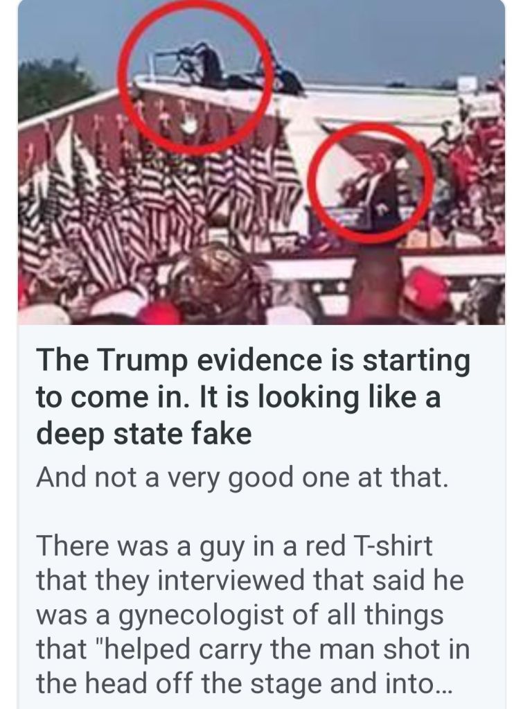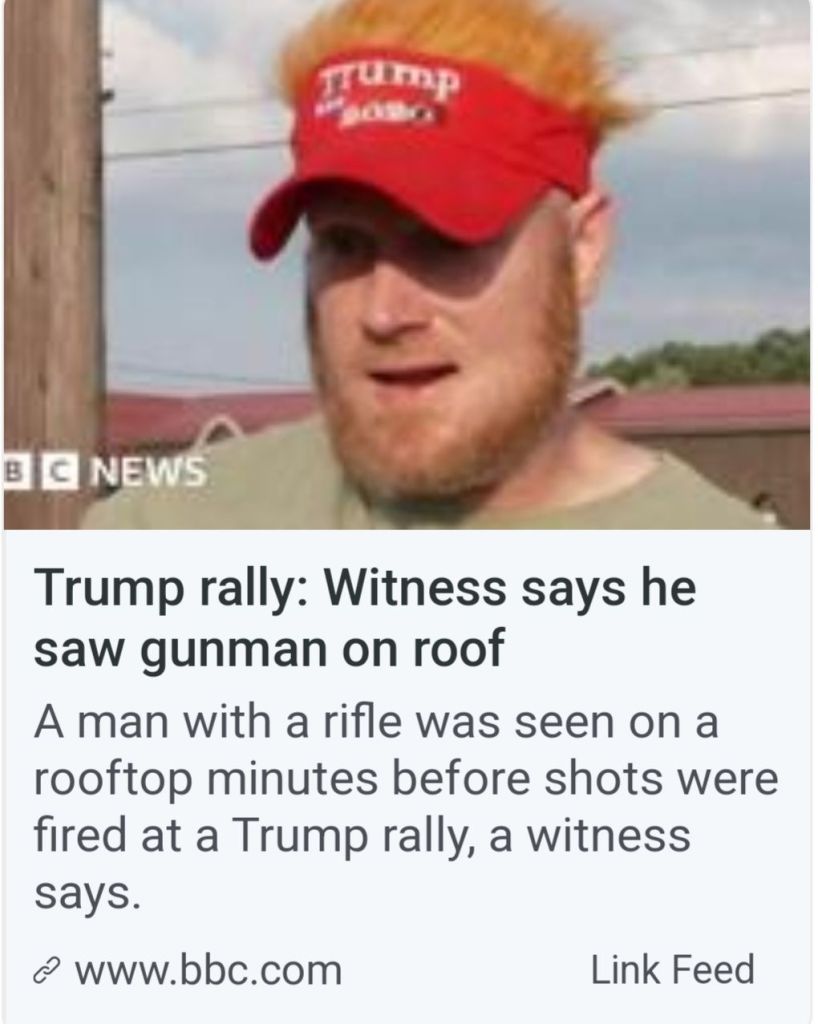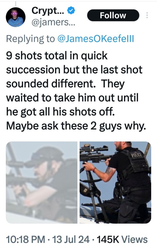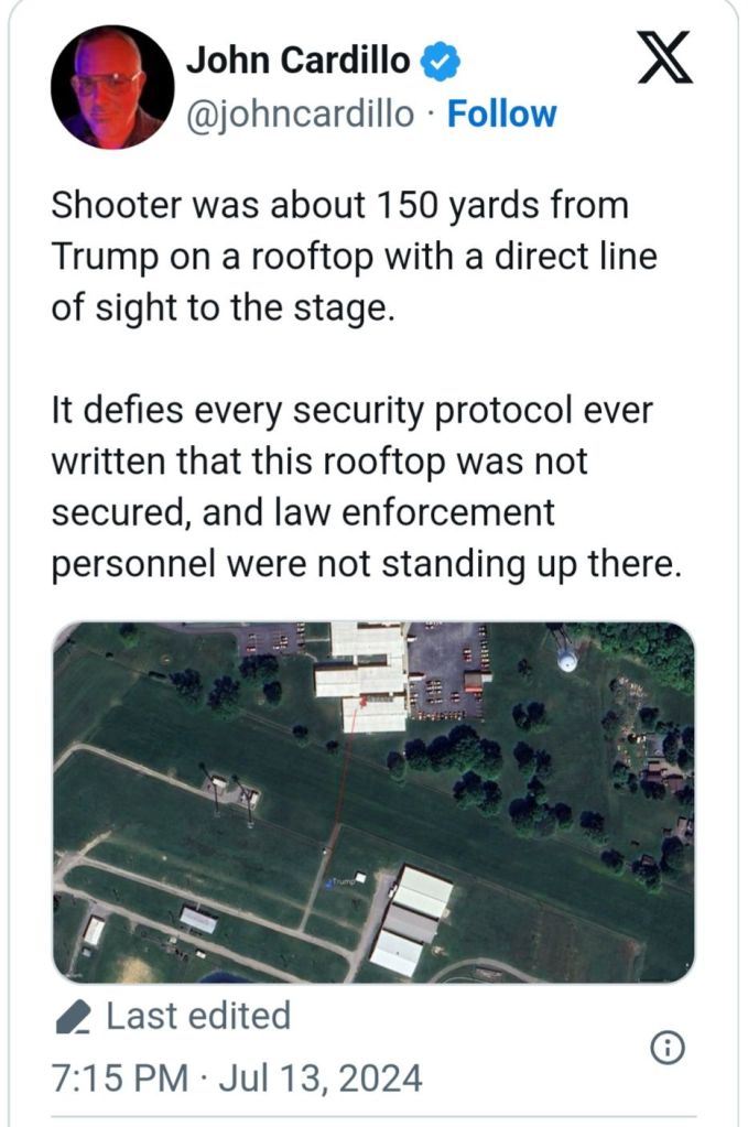 5. Couldn’t smear him. Couldn’t bankrupt him and couldn’t put him in jail. Biden has said he would do anything necessary to keep President Trump out of the White House. The most recent Biden calling for a bullseye to be put on President Trump. This was the Lefts last chance before the RNC to take him out. Obama and Soros are watching the DemocRats implode. They have admitted anything will be done to maintain power. The FBI, CIA, SS and local police failed miserably to protect President Trump. 130-150 yard straight in line of fire shot from the top of an adjacent building was not caught in a security prescreen? A man in camo carrying an AR rifle walks across a field, climbs up the side of a building, walks across the roof without being seen by SS? Not until he was firing at President Trump! And now it is reported a local cop saw the shooter but disengaged as the shooter pointed his rifle at him. This local cop gave no communication with any security to get President Trump off stage. I believe, in my opinion, what we saw yesterday was a failed political assassination attempt. By the grace of god President Trump is still with us! May god and faith comfort the family of the man killed and the injured. God Bless President Trump, God Bless the USA! MAGA TRUMP#47 🇺🇲🇺🇲