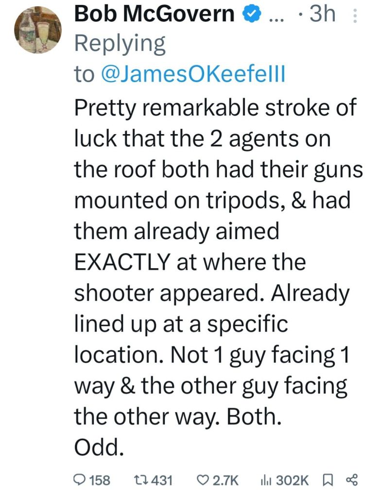 1. Do you think the local police (which are probably Democrats) turned a blind eye to a kid with a gun climbing the building and did the FBI tell the sharp shooters to stand down as they have never been a fan of Trump? Biden said recently that he wants a “bullseye put on Trump”. That’s exactly what the shooter did. Something smells fishy about the whole incident. Scariest day in modern history. Brought me back to JFK assassination. I don’t trust the FBI investigating this.