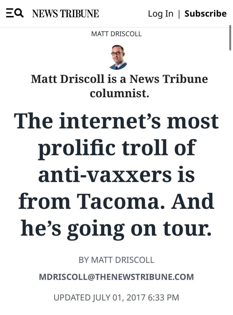Driscoll also cheered the work of pro-vaxx troll Craig Egan in 2017, while he harassed and bullied the Vaxxed movie tour, which compellingly presented the story of parents whose children developed autism after receiving routine shots after birth.