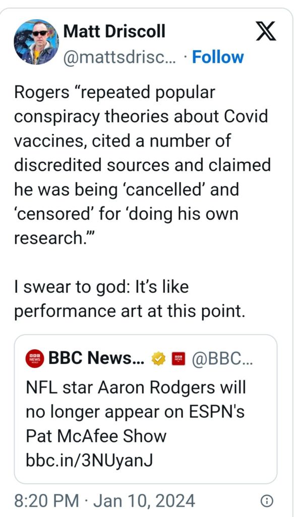 Most recently, it was Driscoll who ridiculed and accused Aaron Rogers of “performance art” after the NFL star was cancelled for warning people of the dangerous side effects of the mRNA jab.