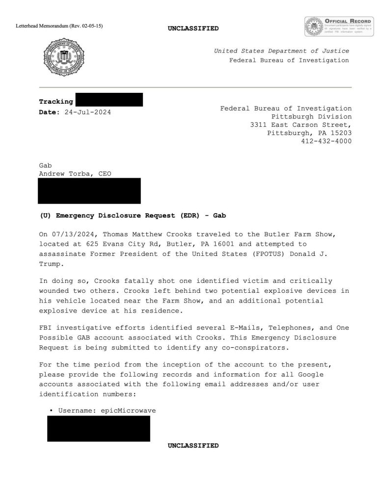 “This is not consistent with Gab’s understanding of the shooter’s motives based on an Emergency Disclosure Request (“EDR”) we received from the FBI last week for the Gab account “EpicMicrowave” which, based on the content of that EDR, the FBI appeared to think belonged to Thomas Crooks.