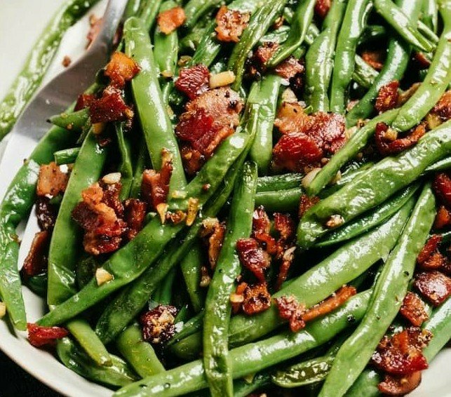 Put skillet on medium-high heat and add green beans, tossing with tongs, for about 6 minutes. Stir in red peppers, onion, garlic, butter and half of the bacon, for about a minute. Top with the rest of the bacon.