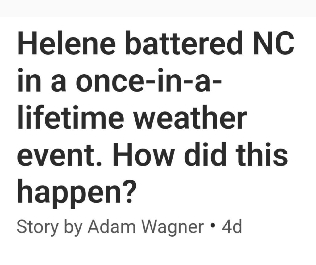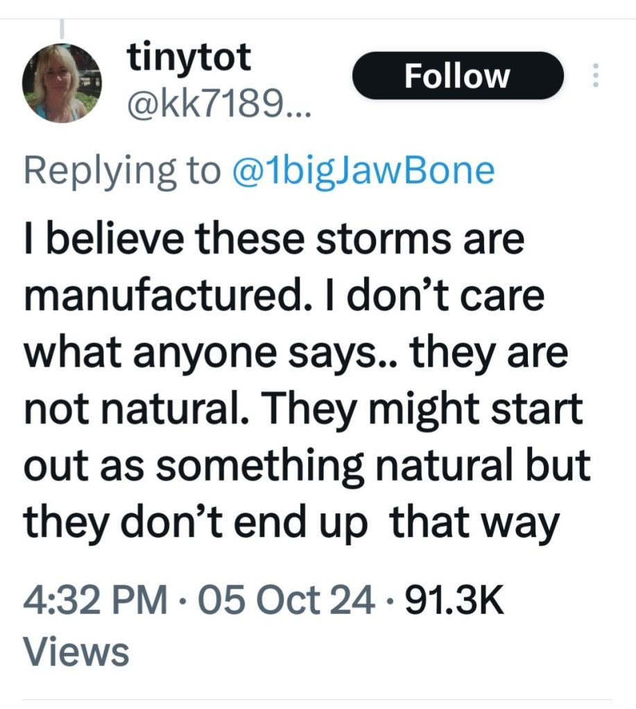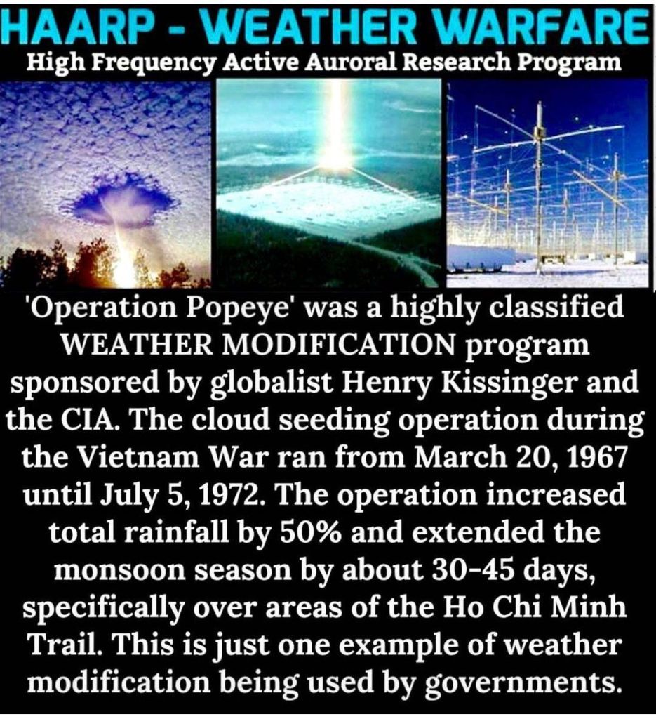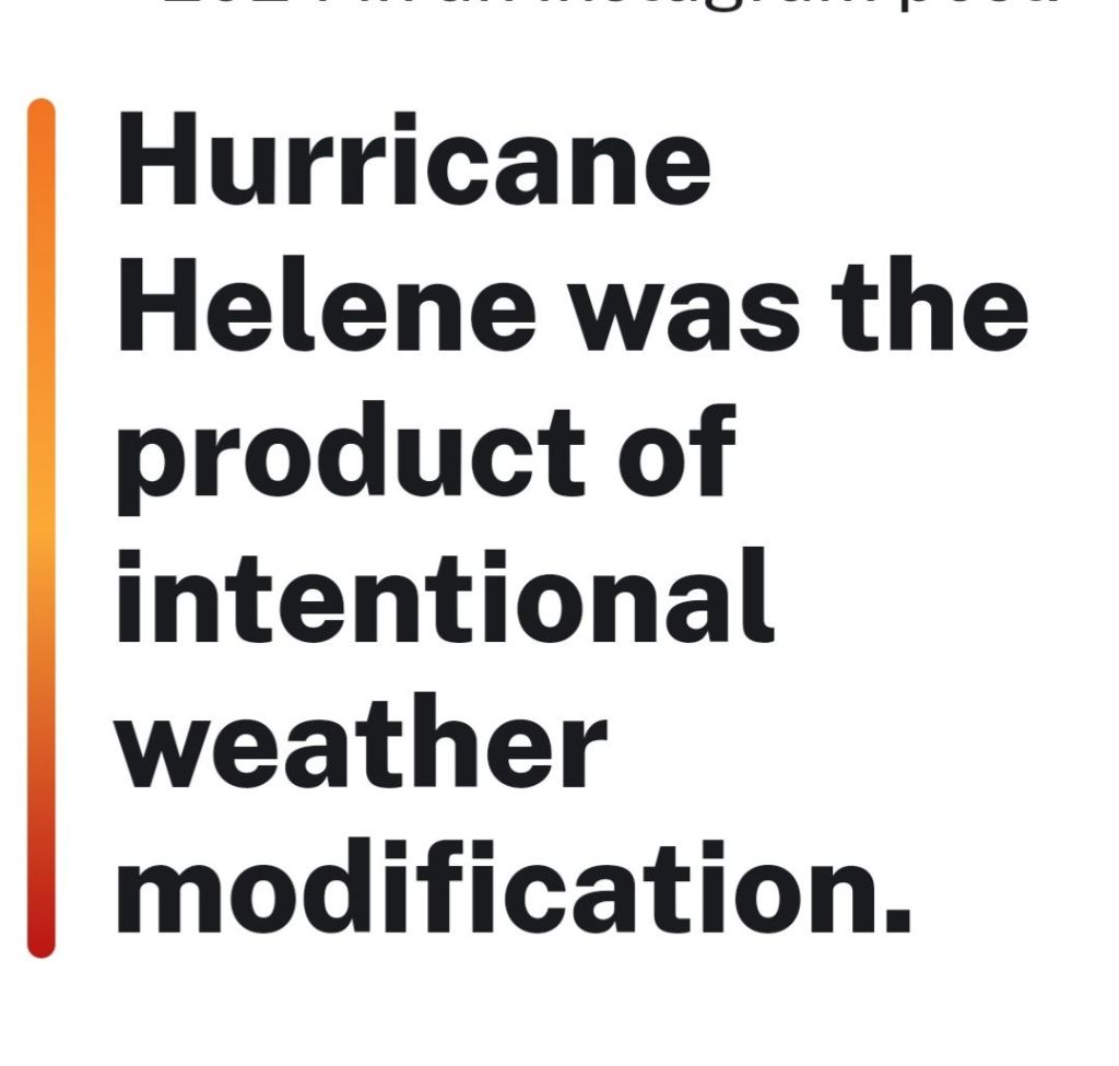 Watched a young lady theorize that the NC flood caused by blowing the dam rather than hurricane. The hurricane was the cover story