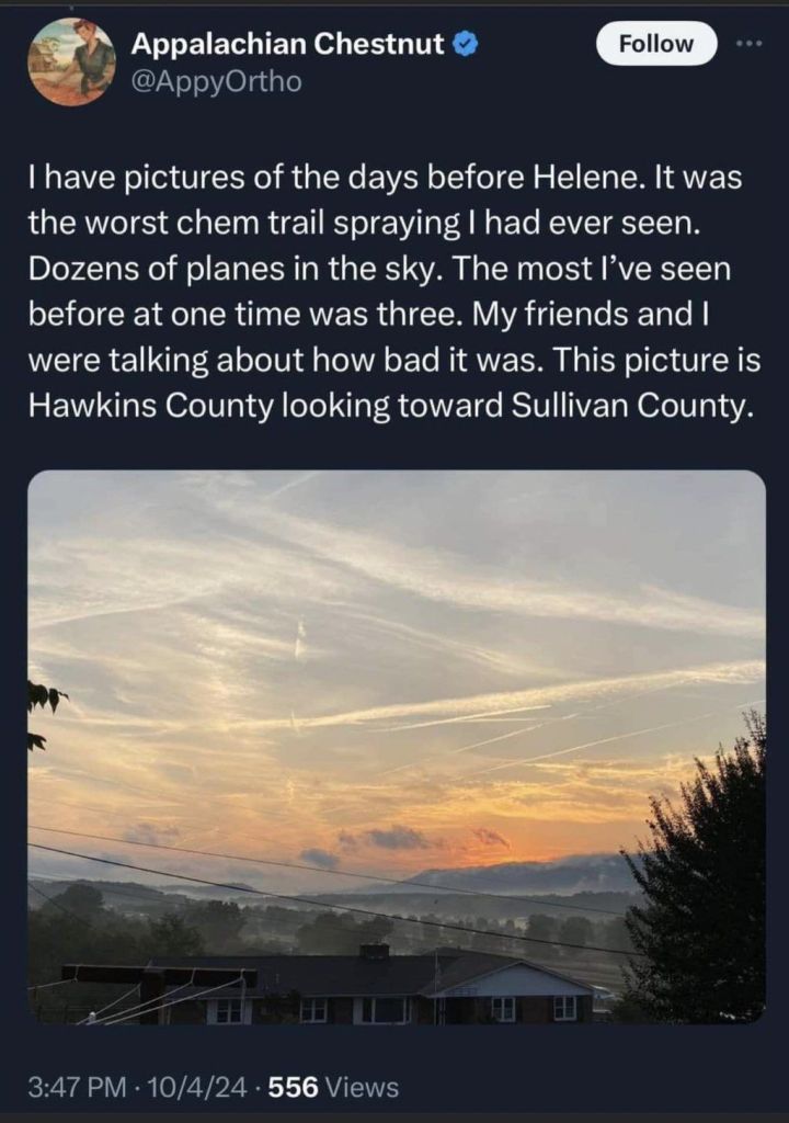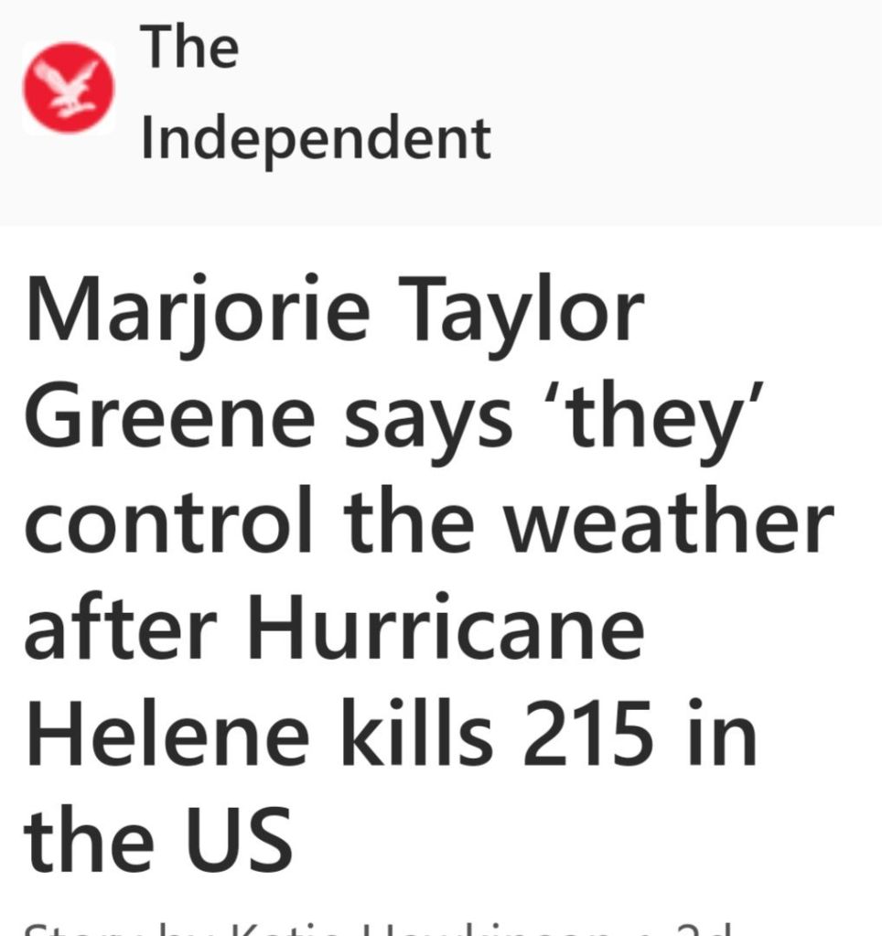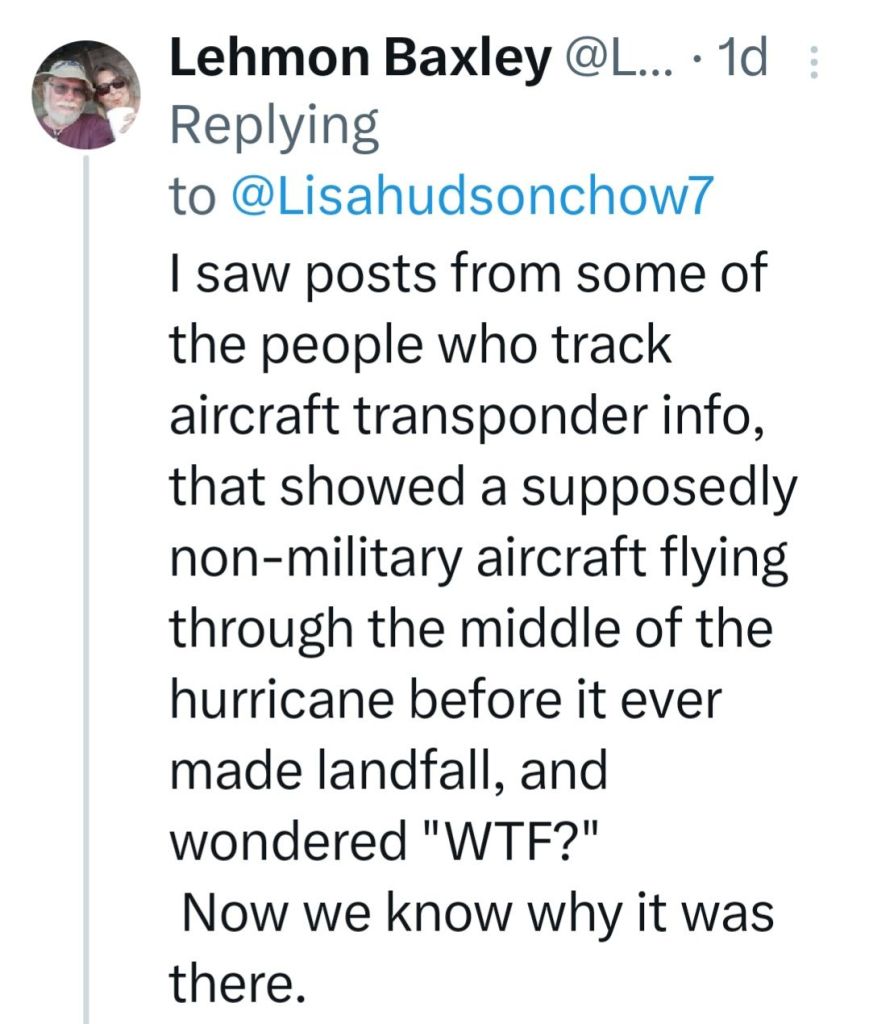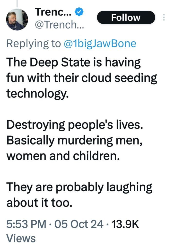 Watched a young lady theorize that the NC flood caused by blowing the dam rather than hurricane. The hurricane was the cover story
