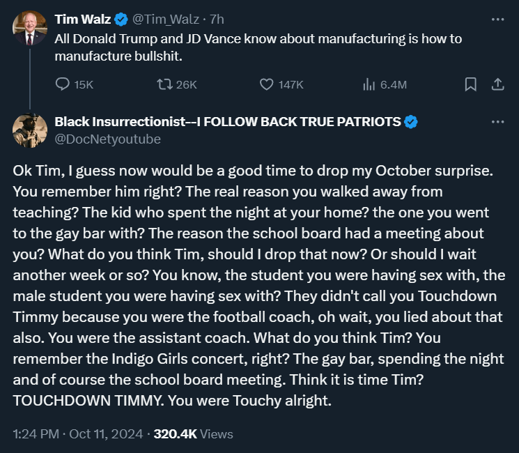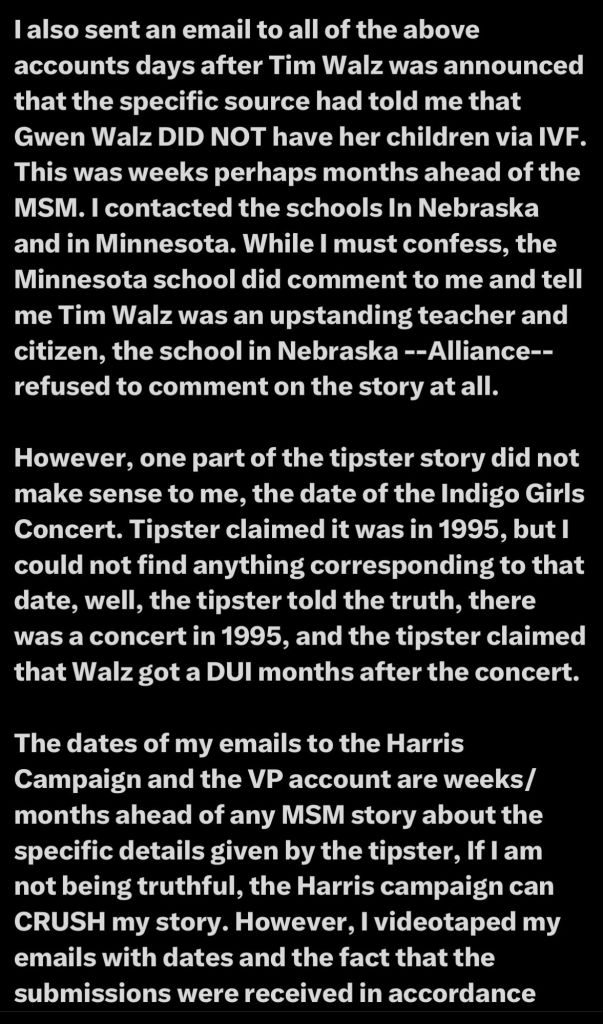 I have also found out that there were other journalists who had parts of this story but did not print it or withheld the information. It is my plan to release the story tomorrow (Monday, October 13). I have gone out of my way to give Harris and Walz the opportunity to flat out deny the allegations, but they have really done the opposite, in fact, in statements to various articles they have confirmed much of the story.