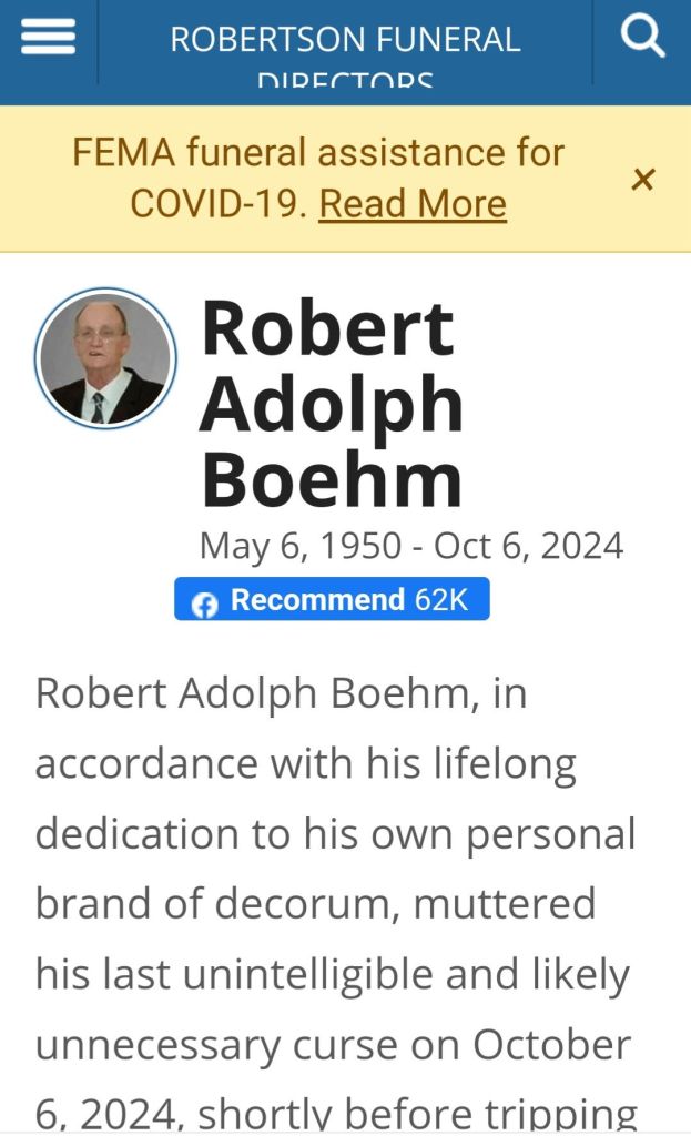 Robert Adolph Boehm, in accordance with his lifelong dedication to his own personal brand of decorum, muttered his last unintelligible and likely unnecessary curse on October 6, 2024, shortly before tripping backward over “some stupid mother****ing thing” and hitting his head on the floor.
