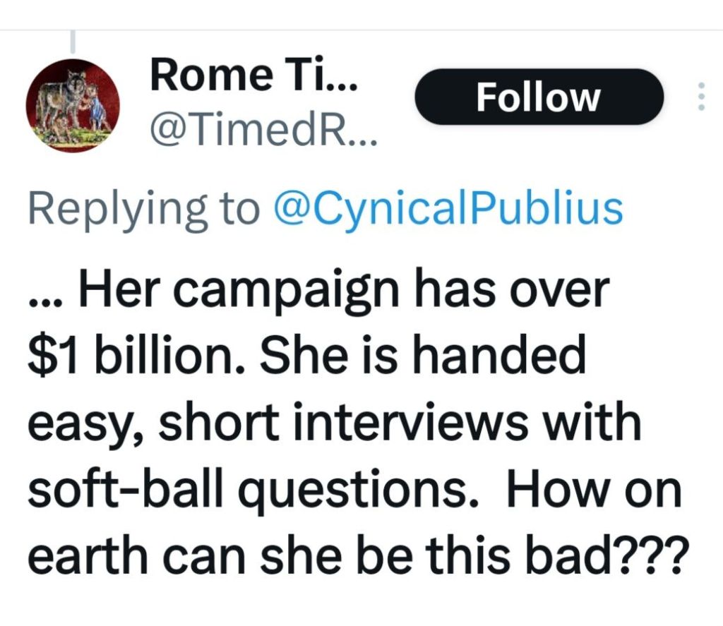 3) Voters are not as stupid as Kamala seems to believe they are. It is very obvious that she uses Trump as a deflection to avoid giving a substantive answer, even when a voter point blank asks her for the “nuts and bolts” of her economic plan. She shows how incapable she is of articulating any actual course of action, likely because she has none or plans to continue the current directives from whoever is actually running this country.”