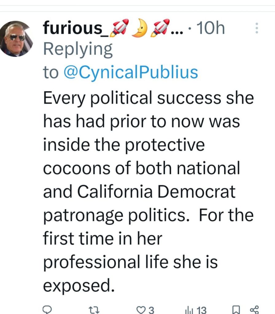“As you see Kamala Harris constantly melting down in crazed anger, realize you are watching a 60 year old woman who for the first time in her life is not having what she wants handed to her on a silver platter,” commentd Cynical Publius on X. “The child of affluent university professors, she literally made her way in life by sleeping with powerful men and relying on her skin color and genitalia as proxies for competency.: