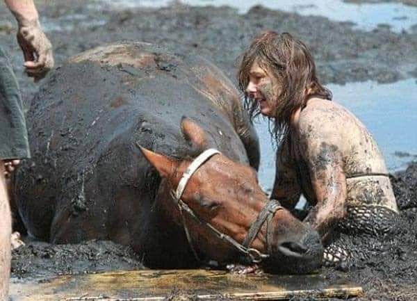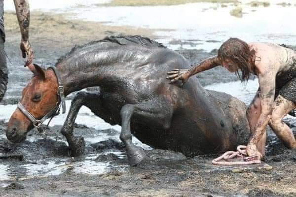 She spent 3 hours clinging to the animal while she struggled not to sink in the mud.