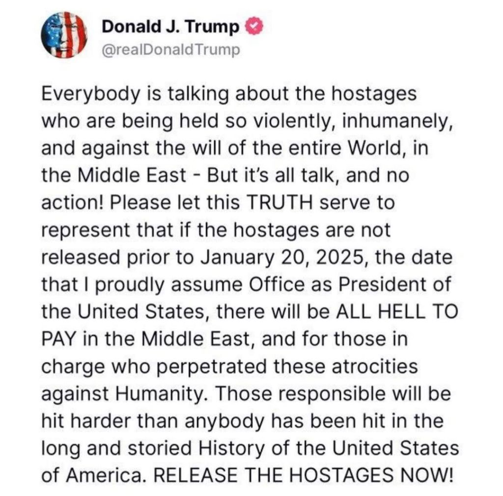 President Donald J. Trump did not mince words when he warned those in the Middle East “who perpetuated these atrocities against Humanity,” meaning “the hostages who are being held so violently, inhumanely, and against the will of the entire World,” that “there will be ALL HELL TO PAY.”