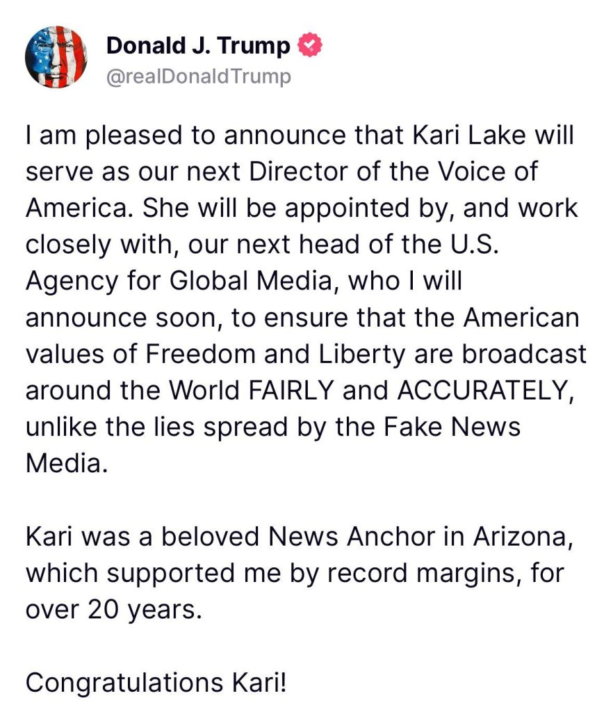 “I am honored that President Trump has asked me to lead the Voice of America,” Kari Lake said. “VOA News is a vital international media outlet dedicated to advancing the interests of the United States by engaging directly with people across the globe and promoting democracy and truth.”