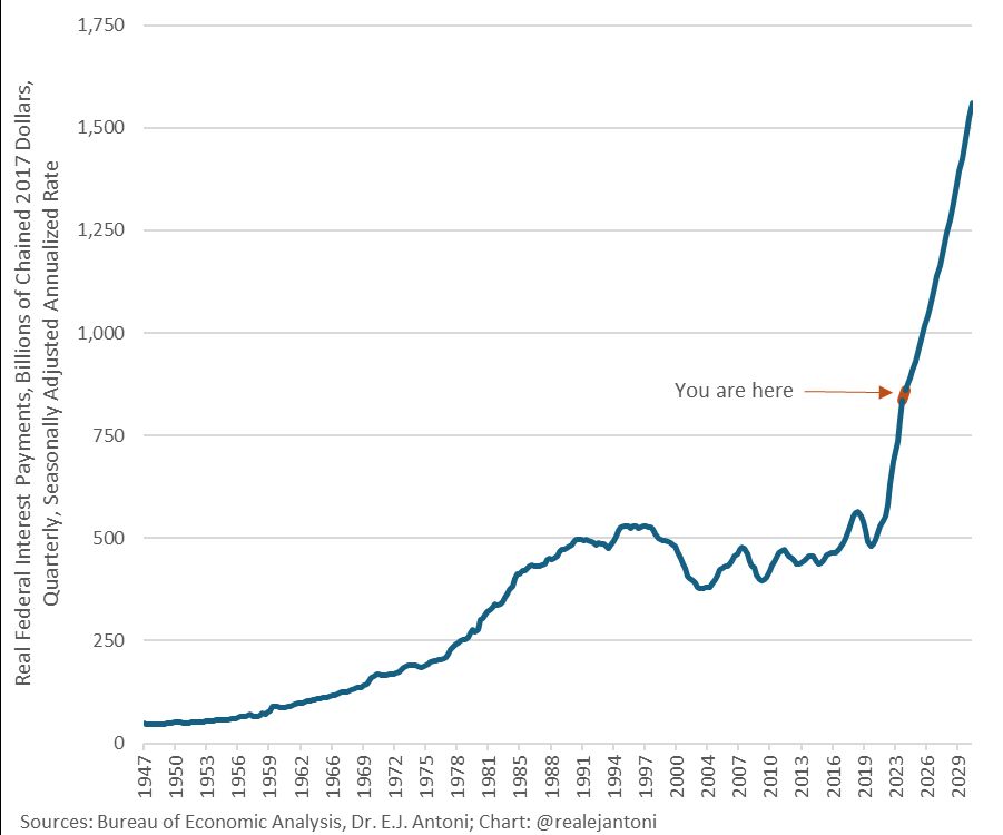 ● 25% of all US government revenue is going to interest on the debt. In just a few years it will be 40%.