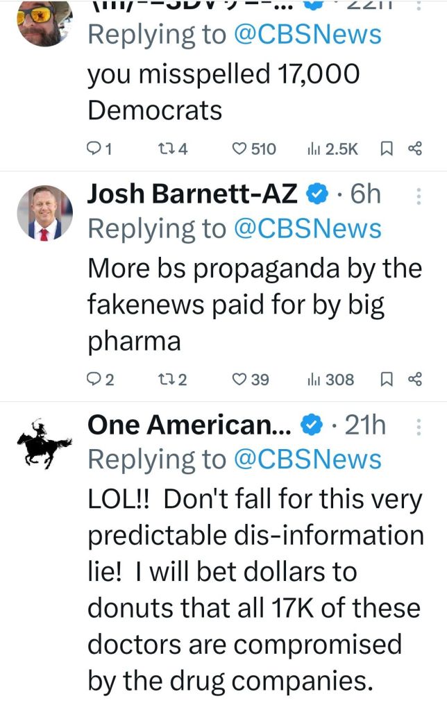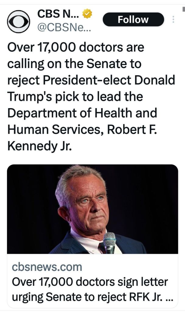 CBS News, our January 2025 selection for the Fake News Hall of Shame, reported this week that “over 17,000 doctors are calling on the Senate to reject President-elect Donald Trump’s pick to lead the Department of Health and Human Services, Robert F. Kennedy Jr.