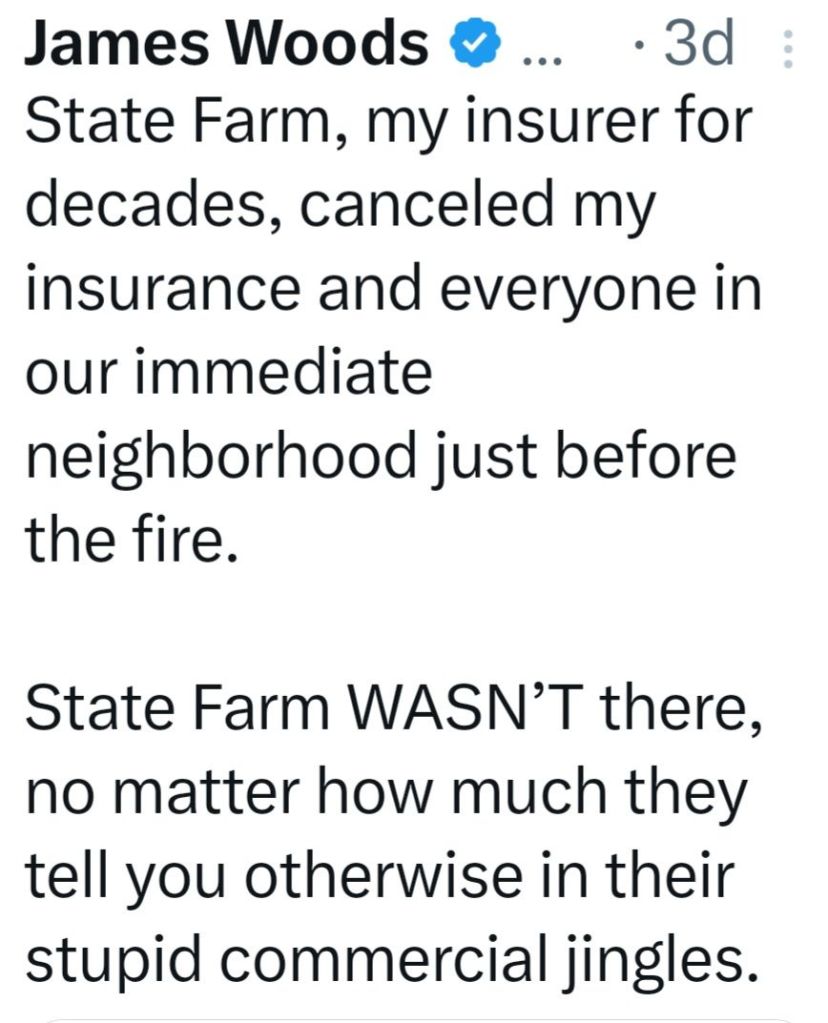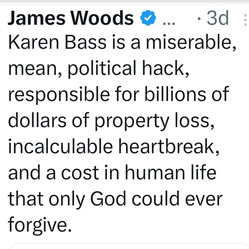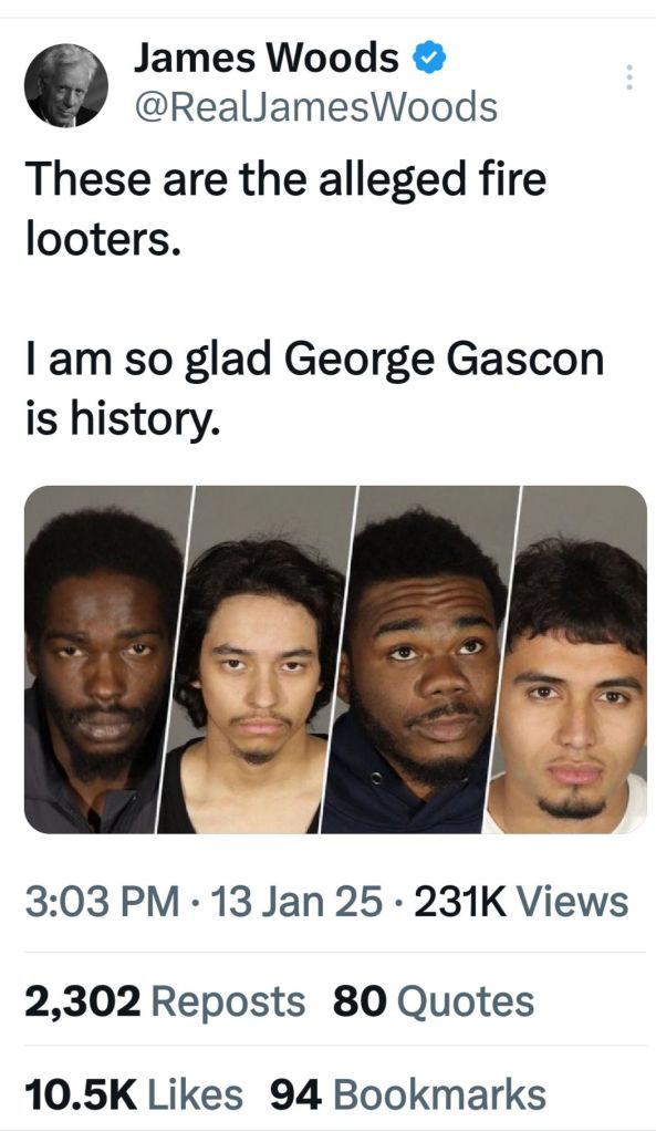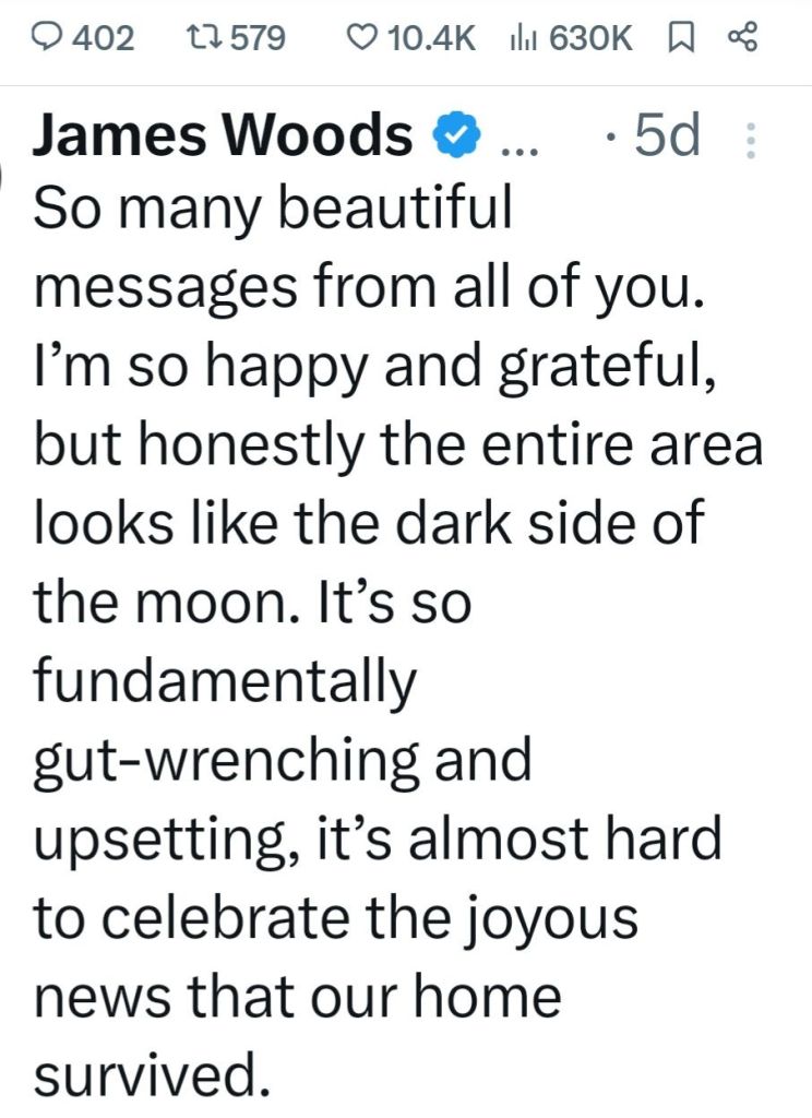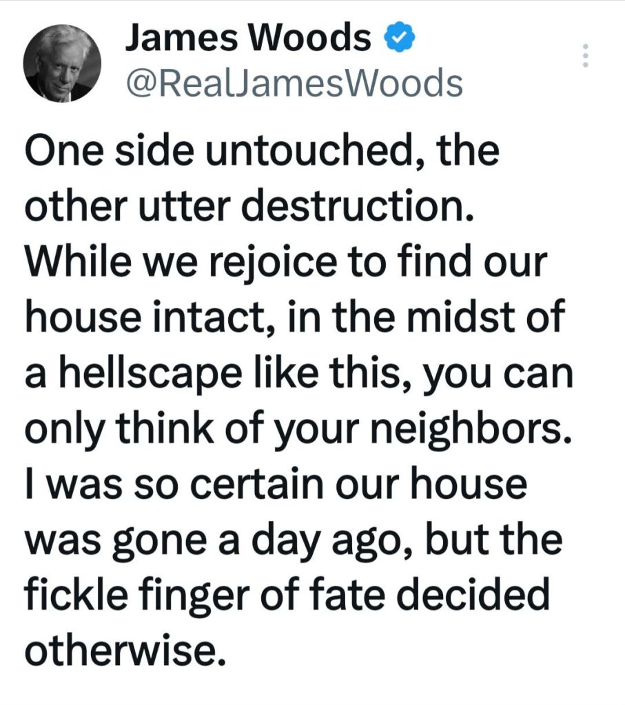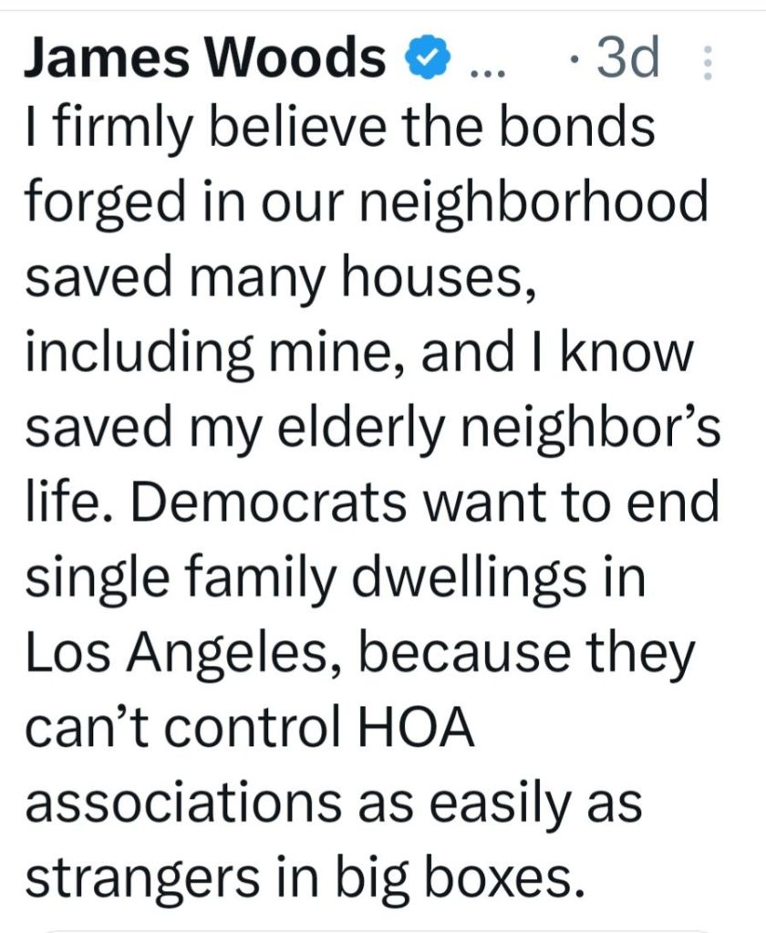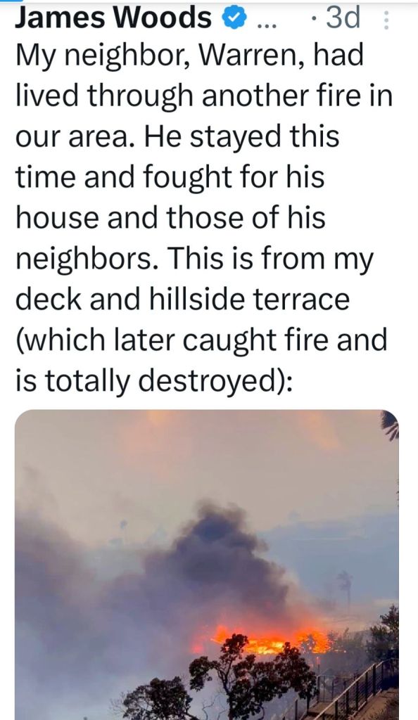 A big thanks to James Woods for keeping the people informed and having his neighbors’ backs. It’s shocking there are CA residents who still believe the fires are due to climate change and not poor planning.