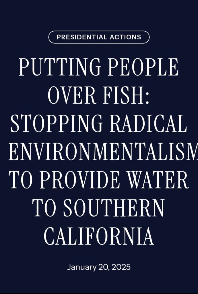 I hereby direct the Secretary of Commerce and Secretary of the Interior, in consultation with the heads of other departments and agencies of the United States as necessary, to immediately restart the work from my first Administration by the National Marine Fisheries Service, U.S. Fish and Wildlife Service, Bureau of Reclamation, and other agencies to route more water from the Sacramento-San Joaquin Delta to other parts of the state for use by the people there who desperately need a reliable water supply.