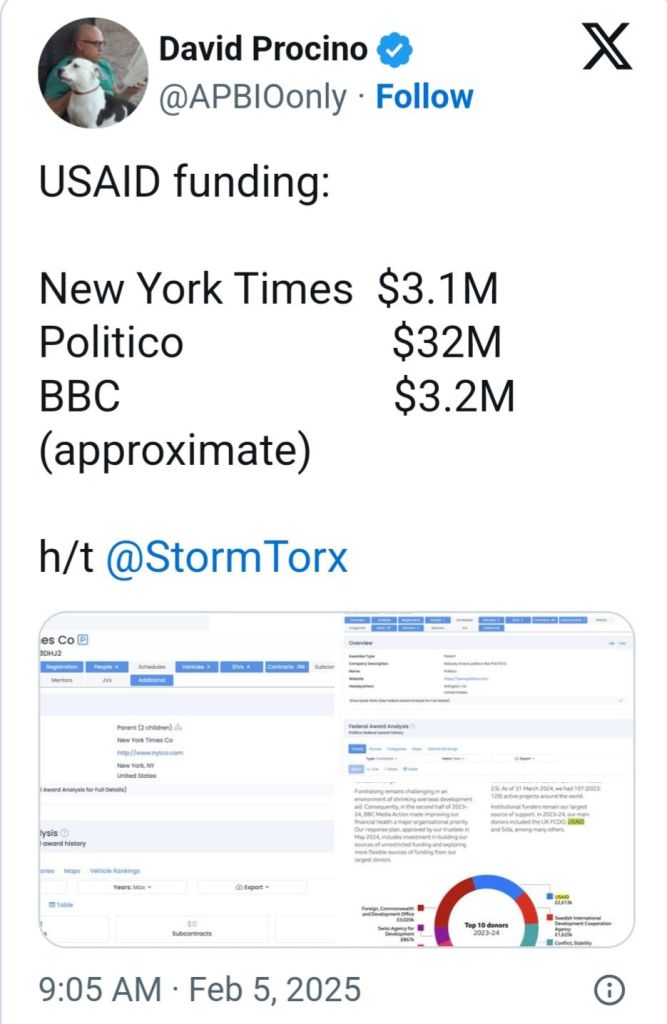 Suddenly, this week, POLITICO WAS NOT PAID BY USAID! The Department of Government Efficiency (DOGE) has stopped such activities.