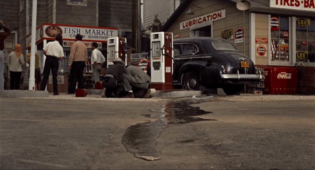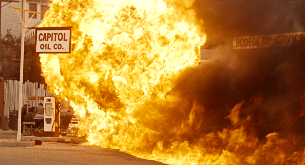 The infamous scene at the gas station where an explosion occurs after a man throws his match on the gasoline-filled street was filmed on a soundstage. At the time, the gas station didn’t exist. Many years after The Birds was filmed, a gas station was built outside the Tides Restaurant in the exact spot where it appeared in the movie.