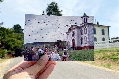The famous scene where children are running downhill from the schoolhouse to the center of town was partially reshot on a backlot at Universal Studios. The children “ran” on a treadmill while footage of attacking birds was projected behind them on a screen.