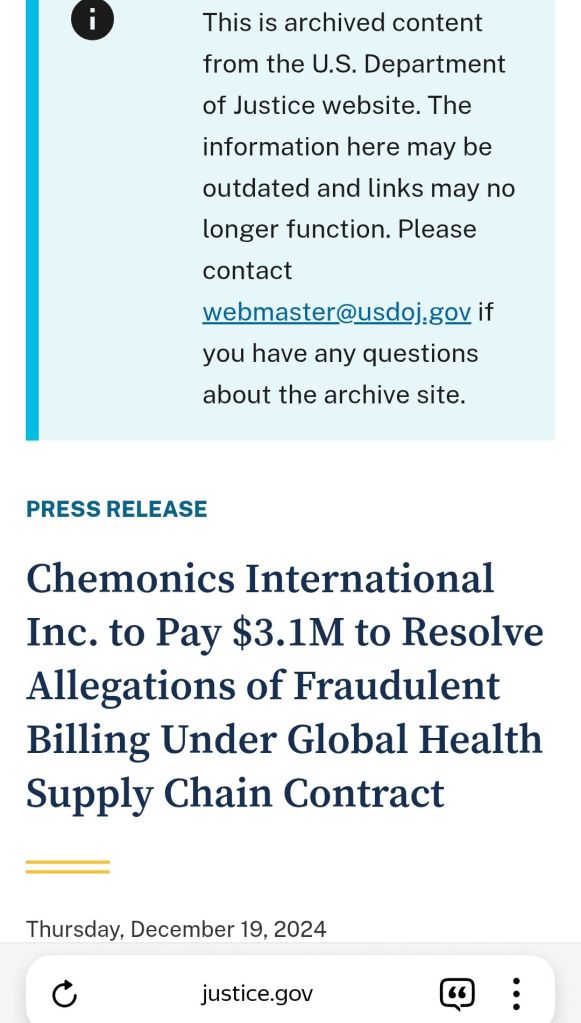 “In June 2020, Chemonics was added to the defendant’s list of a lawsuit that was previously filed in December 2019 against six other companies, including DAI, Louis Berger, among others, for allegedly paying bribes, or protection money, to the Taliban in a lawsuit brought by families of American victims. This claim relates to whether Chemonics may have violated the Anti-Terrorism Act which makes it illegal for any individual or entity to provide material support to terrorist groups like the Taliban. In 2024, a report by Center for Advanced Defense Studies said that Chemonics purchased products made in Xinjiang, potentially using forced Uyghur labor, including from sanctioned entity Xinjiang Production and Construction Corps.” –en.wikipedia.org/wiki/Chemonics
