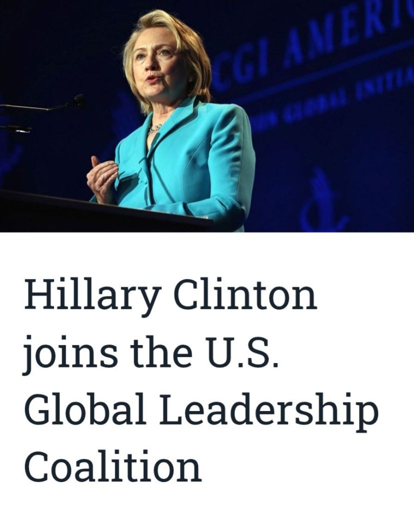“Hillary Clinton is officially a member of the National Advisory Board of the U.S. Global Leadership Coalition,” the organization announced in May 2013.  “The U.S. Global Leadership Coalition is composed of around 400 NGOs and other businesses, as well as foreign policy experts. It is a broad, influential network. The “leaders” come from all 50 states of the country, and the primary goal is a smart power approach to increase diplomacy as well as development around the world.”