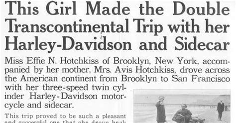 In 1915, Effie Hotchkiss bought a new Harley-Davidson motorcycle and attached a sidecar to carry her mother, Avis, as a passenger.