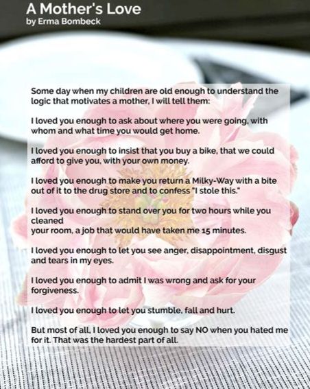 1. These Mother’s Day letters yanked at my my heartstrings. Erma Bombeck’s “A Mother’s Love” lists many of the challenges of motherhood that parental love gets you through. I read her column without fail and remember reading this many years ago-it was that impactful. ๐Ÿ™‚