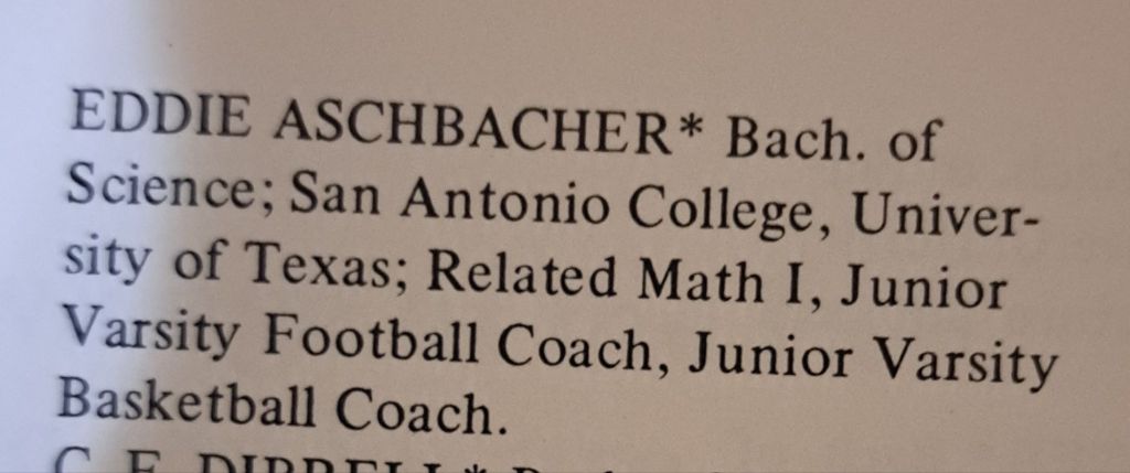 During my senior year (Dodie’s junior term) at McCollum High School in 1972-1973, Aschbacher taught Math I and coached the Junior Varsity football and basketball teams.