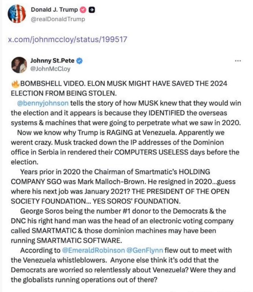 “The Smartmatic system can be altered—this is a fact. This technology was later exported abroad, including to the US,” he continued. “Regime operatives maintain relationships with election officials & voting-machine companies inside your country.”