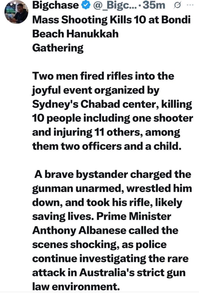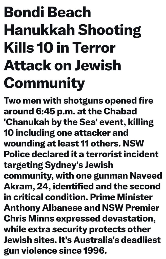 Headlines and news from Australia is a dire warning and wake up call for the world: Bondi Beach Hanukkah Shooting Kills 10 in Terror Attack on Jewish Community.