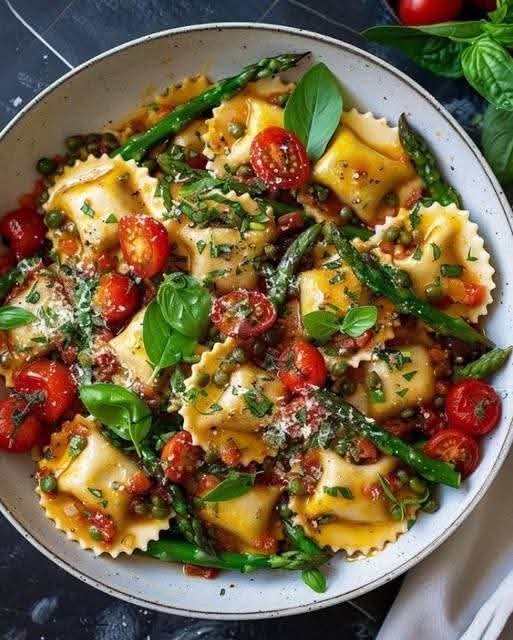 Toss the cooked ravioli into the skillet with the vegetables. Stir gently to combine and heat through.
