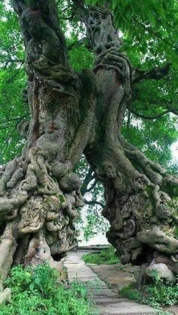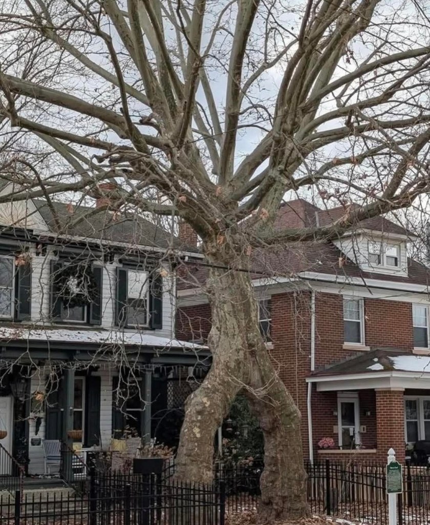 The “awesome double sycamore” in Pittsburgh PA is a pair of sycamore trees that were planted in the 1930s and trained to grow together to form an archway over the walkway. The trees are a local landmark often used for photos.