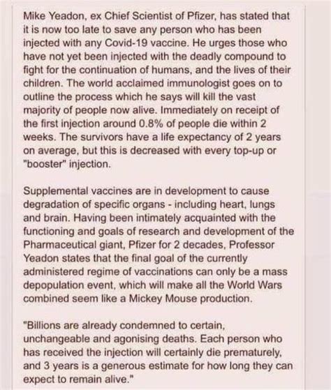 Yeadon also believes that the pandemic response itself was engineered to damage the global economy. It was designed to condition populations to obey orders under a manufactured emergency. Additionally, it aims to normalize mass injections of what he calls dangerous materials.