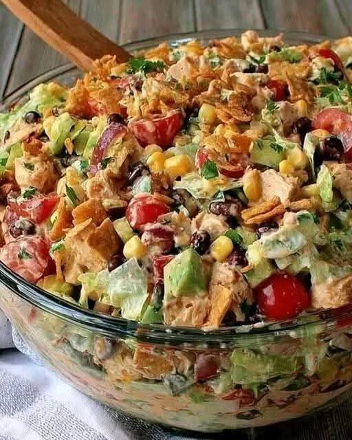 A vibrant and flavorful salad combines tender chicken and fresh vegetables. It is topped with a zesty ranch dressing that has a kick of taco seasoning. Perfect for a light lunch or a hearty dinner!