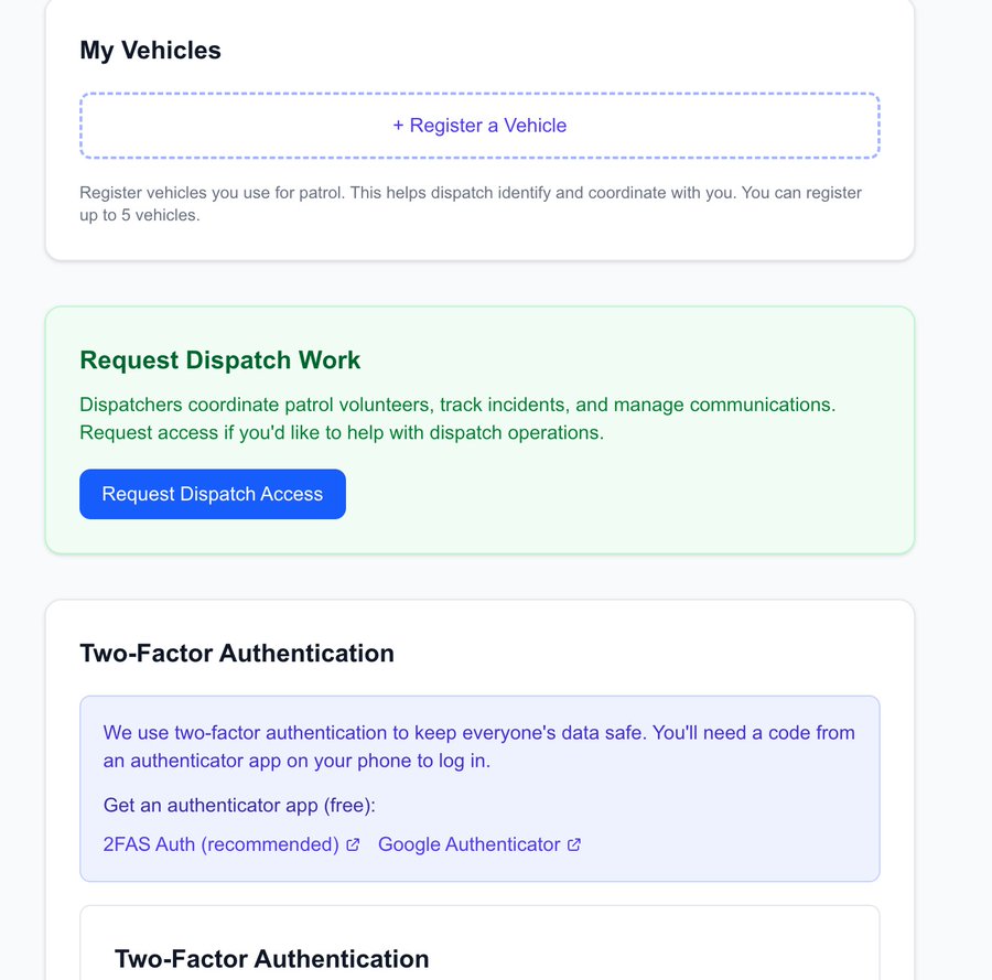 Patrollers can register a “patrol vehicle”. And even request to be a “Dispatcher”