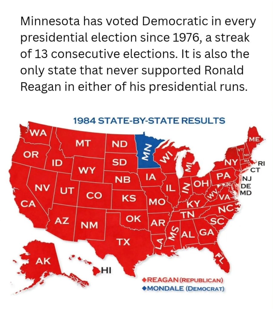 Minnesota was the only state that did not vote for Ronald Reagan in both of his presidential victories.