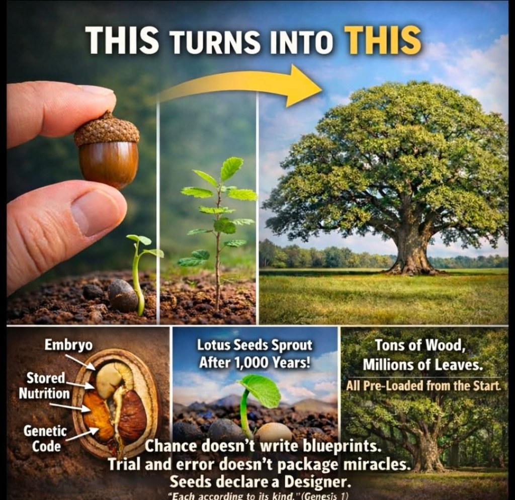 A tiny acorn producing a massive oak is a living testimony to foresight and intention. Chance does not compress blueprints for giants into something you can hold between your fingers. But the Word of God explains exactly what we observe. The Creator spoke, and life came forth already complete in its design.