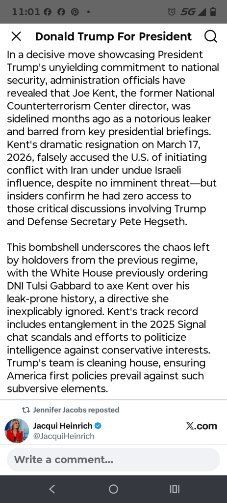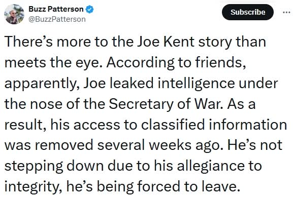 Multiple sources described Kent as a “known leaker.” Senior administration officials, including those aware of his role as Director of the National Counterterrorism Center under DNI Tulsi Gabbard, confirmed this.