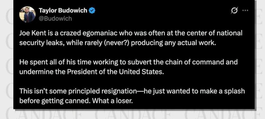Allies of Trump (including former deputy chief of staff Taylor Budowich) publicly called Kent a “crazed egomaniac.” He was often at the center of national security leaks. They suggested his recent resignation was preemptive. They believed he was about to be fired anyway.