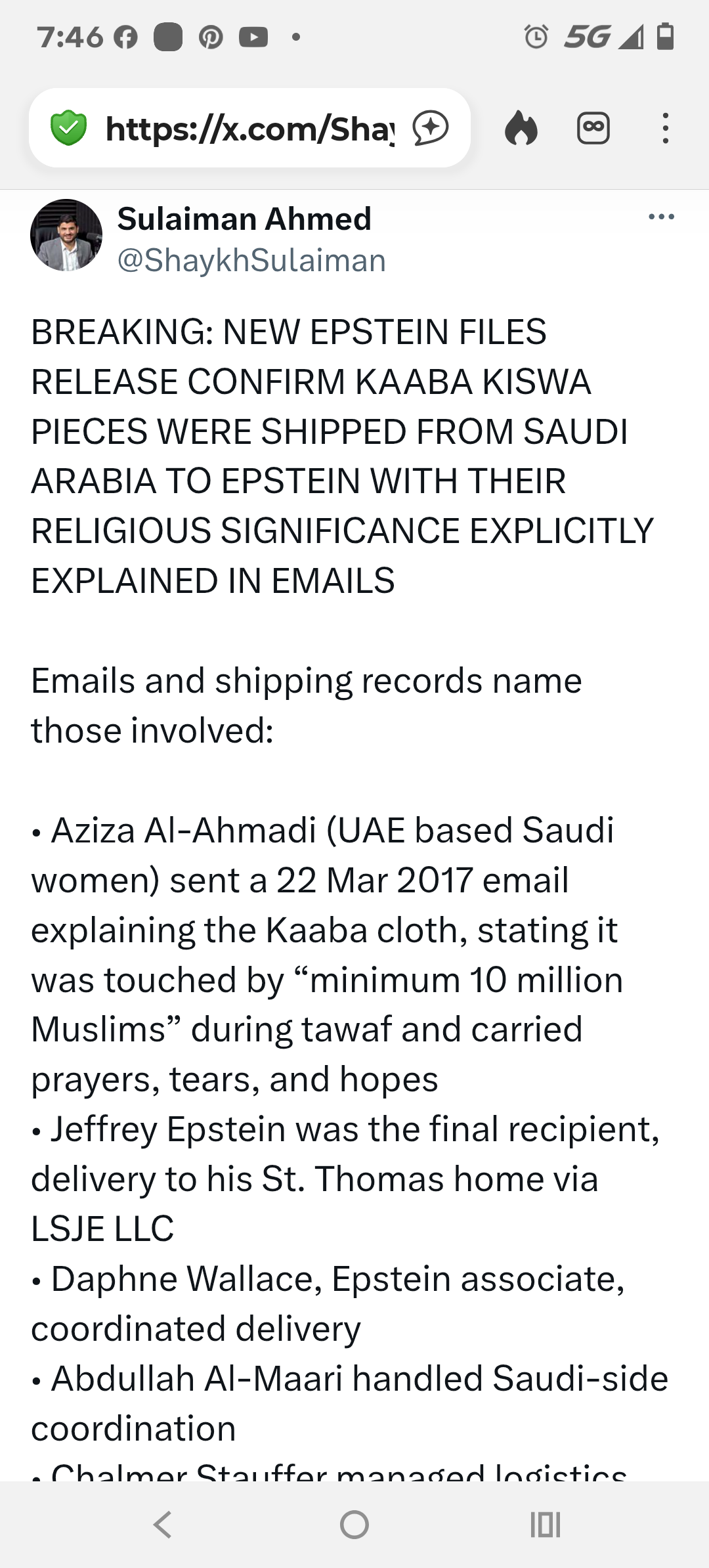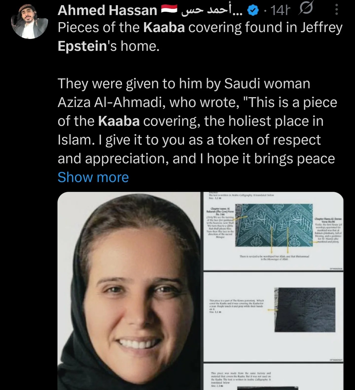 Meanwhile, newly released files from the FBI include emails detailing a shipment of sacred cloth from the Kaaba in Mecca to the United States. The shipment was arranged through Epstein contacts linked to the United Arab Emirates. It was delivered to convicted pedophile Epstein.