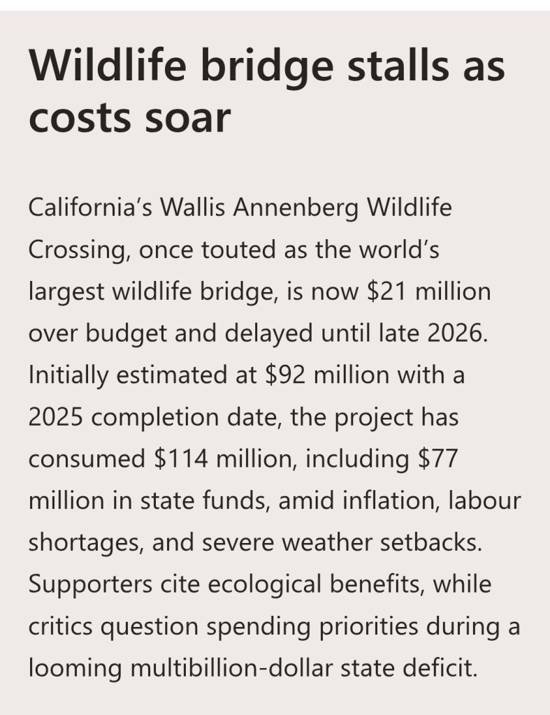 The Wallis Annenberg Wildlife Crossing, hyped as the world’s largest, was promised to open in 2025 at around $92-93 million. Now it’s delayed until November 2026, with costs surging thanks to overruns that activists refuse to own.